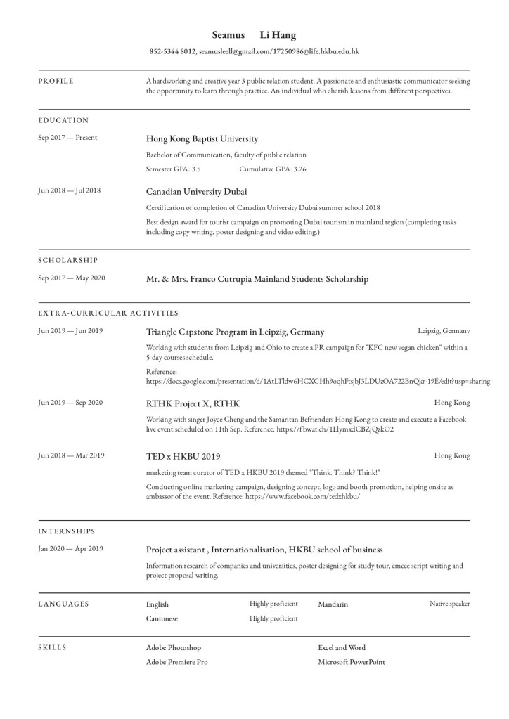 My name is Seamus and I am a year 3 public relation student in HKBU. All you need to know about me is down below and in my homepage. I have a passion for media industry and hope to contribute in any shape or form.